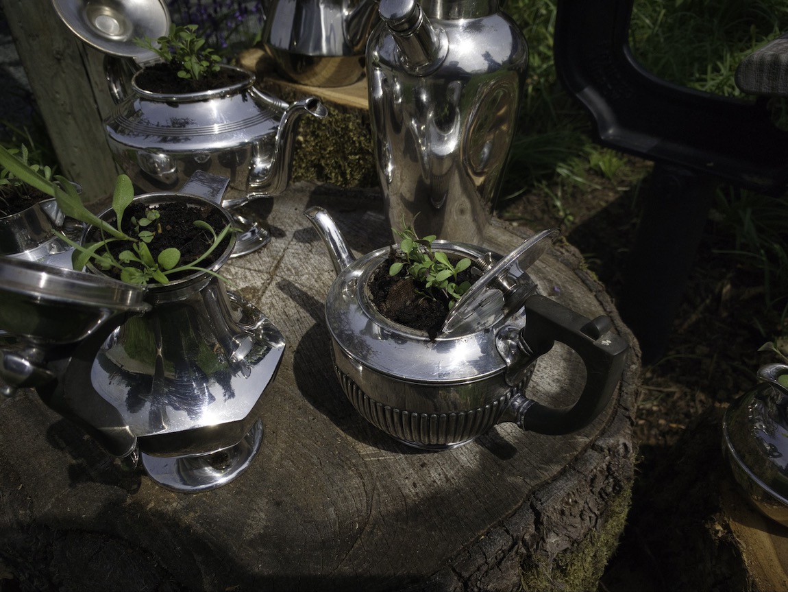 The previous owners of these silver teapots and coffee pots had no further use for them. I was inspired to re-use them as whimsical plant pots.