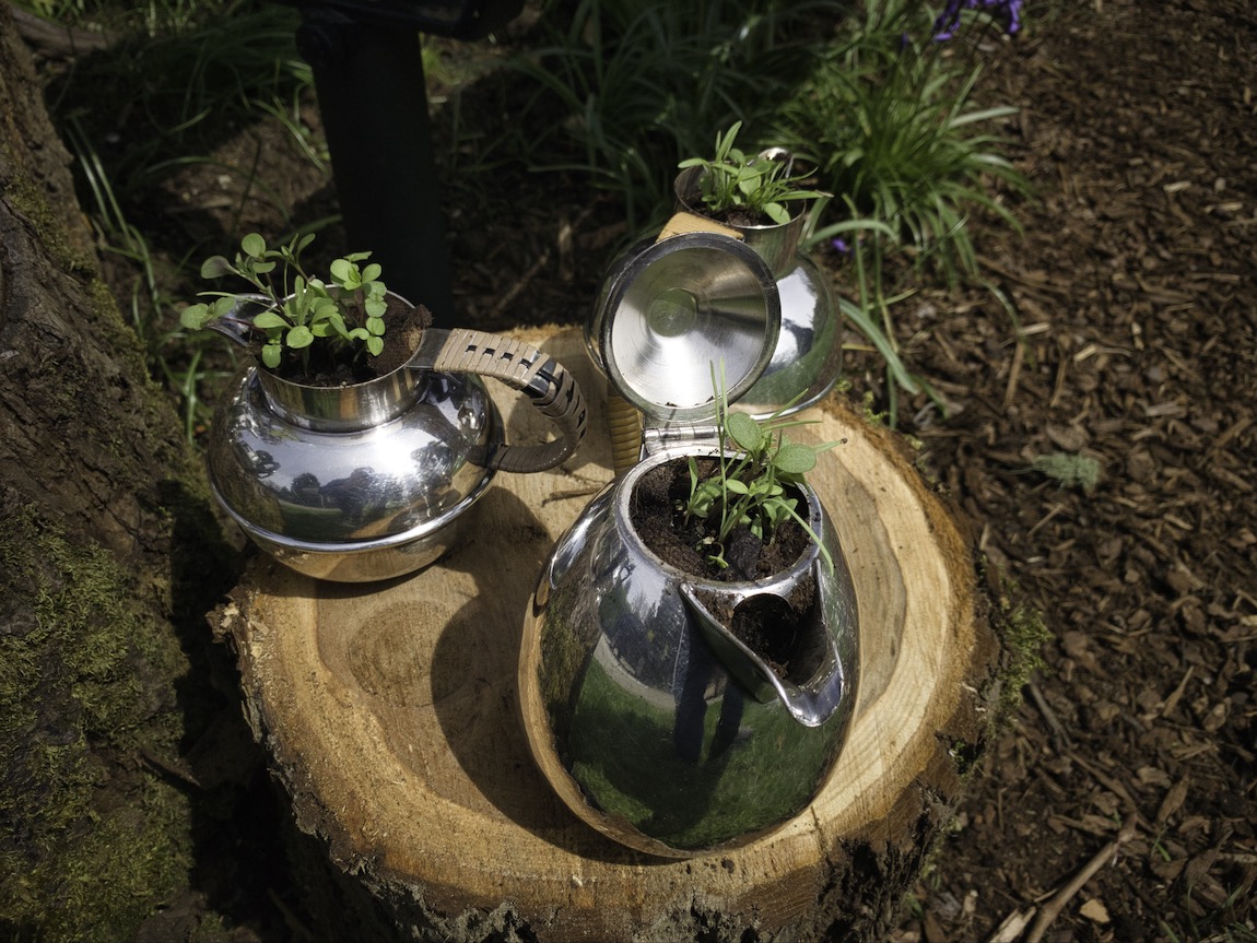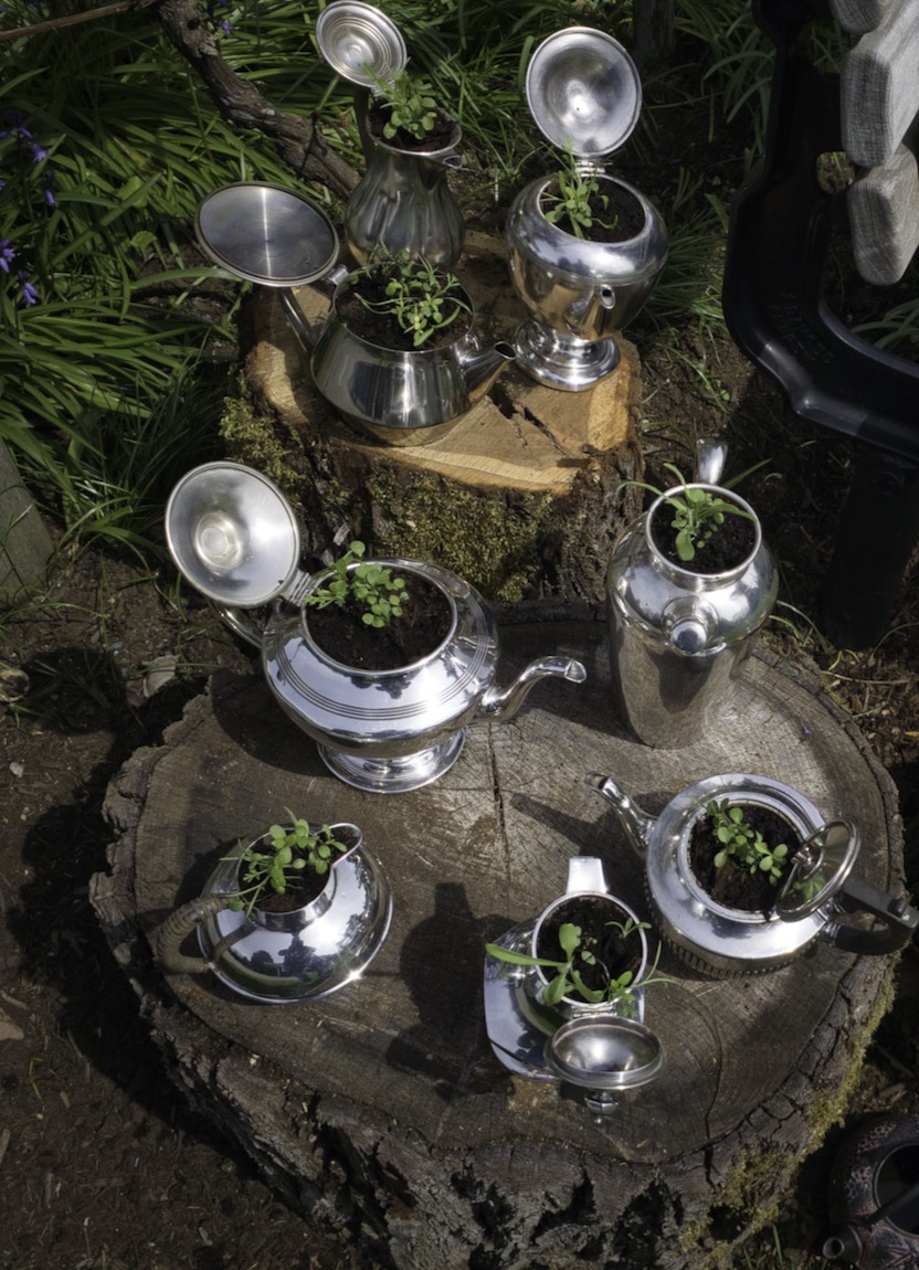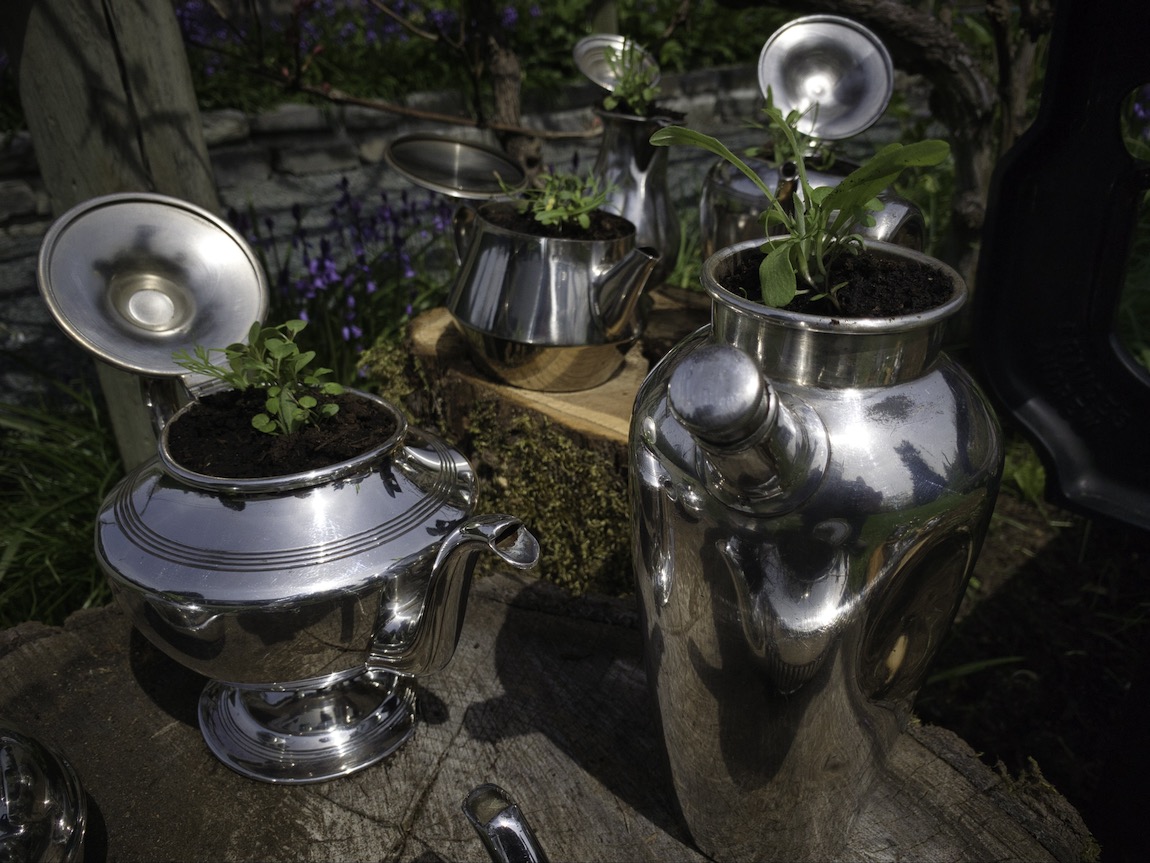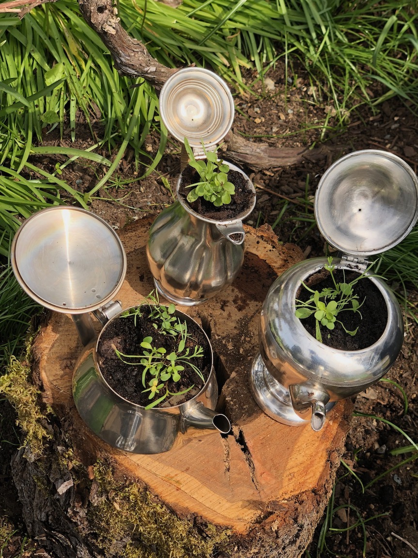 The previous owners of these silver teapots and coffee pots had no further use for them. I was inspired to re-use them as whimsical plant pots.